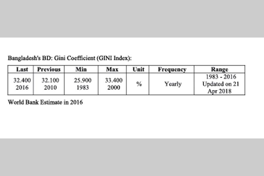 Amidst many positive achievements, an important area of concern for Bangladesh economy is the rise in inequality in income distribution. After all, the dream of economic emancipation through alleviation of economic inequality was one of the driving forces of our liberation war. Regrettably, there has been an increase in the degree of inequality in income distribution from the mid-1980s. As per the latest Household Income and Expenditure Survey (HIES) of Bangladesh Bureau of Statistics (BBS), the country's Gini coefficient, which is the economic measure of equality, stood at 0.482 in 2016, up from 0.458 in 2010, in a worrying development. Historically Gini stood at 33.12 in 2010 from 33.22 in 2005. The Gini coefficient was 25.88 in 1984 and went up to 33.46 in 1996.