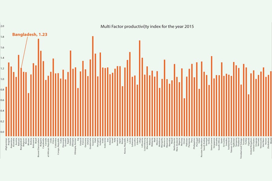Agriculture contributes significantly to economic growth in normal times and can potentially be one of the main solutions to eradicate poverty in Bangladesh. However, failure to swell productivity can be a critical constraint to meeting rapidly rising demand. The graph illustrates the multi-factor productivity or total factor productivity (TFP) index for 108 countries for the year 2015. The data presented in the graph show that the TFP index for Bangladesh is 1.23 which is higher than the average global index which is 1.18. However, there are more efficient countries. The top five countries in the list are Guyana (1.81), Brunei Darussalam (1.76), Libya (1.73), Estonia (1.55), and Bulgaria (1.54). Among South Asian countries, India (1.24) has the most productive agriculture sector. In Asia region, China (1.40) has a better performance.