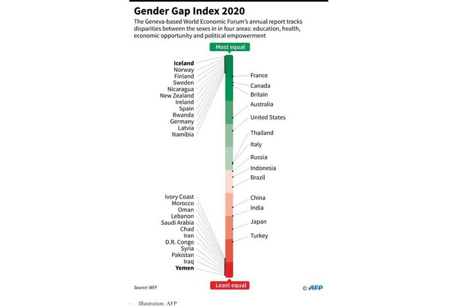 It is quite encouraging that Bangladesh's ranking in global gender gap index has risen to 50th in 2020 from that of 91st in 2006 - the first year of publishing the Global Gender Gap Report by the World Economic Forum (WEF). The index is measured based on the extent of gender-based disparities in four key dimensions or sub-indexes across the world, viz. economic participation and opportunity, educational attainment, health and survival, and political empowerment. The latest report incorporates survey findings on gender disparity and gaps in as many as 153 countries of the world.