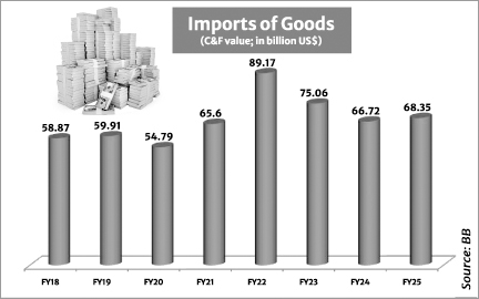 Imports, in terms of clearing and forwarding (C&F) value, stood at US$68.35 billion last fiscal year, which was $66.72 billion in FY24. In terms of free on board (FOB), the value of imports was $64.34 billion and $63.24 billion, respectively in FY25 and FY 24. On average, the FOB value of imports is around $4 billion less than the C&F value.