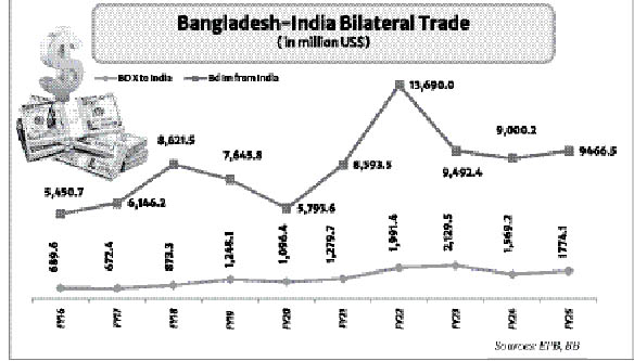 Indo-Bangla bilateral trade increased by 6 per cent to US$11.24 billion in FY25 from $10.57 billion in FY24. The bilateral trade reached its highest level at $15.68 billion in FY22, mainly due to a big surge in imports from India, and it declined to $11.26 billion in FY23. Both exports to and imports from India increased in the last fiscal year, which also widened the trade gap with India. Export increased to $1.77 billion in FY25 from $1.57 billion in FY24, whereas imports from India stood at $9.44 billion and $9.0 billion, respectively.