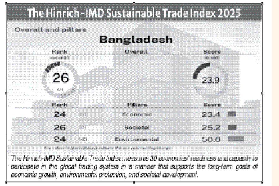Considering the importance of sustainable trade, various international organisations have also took initiatives to examine the diverse aspects of trade and sustainability. Some are also tracking how different countries are moving towards the green trade. The Hinrich Foundation is an organisation that has been working for almost a decade to publish an index of sustainable trade for selected economies, including Bangladesh. The foundation is an Asia-based philanthropic organisation dedicated to advancing mutually beneficial and sustainable global trade. Last month, it released the sixth edition of the Sustainable Trade Index with its partner, the International Institute for Management Development (IMD). IMD partnered with the Hinrich Foundation in 2022 to expand and enhance the index's comprehensiveness. Since then, the index has included 30 economies and is published annually. In the previous three indices, only 20 countries were included, and the publication was biennial.