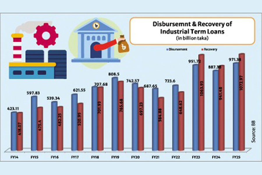 A look at the trend of disbursement and recovery of the industrial term loans for the last decade gives some interesting scenarios. First, the annual average growth of term loan disbursement was 9.0 per cent, whereas the recovery growth rate stood at 10.85 per cent. Second, disbursement of the term loans dropped in four fiscal years between FY15 and FY25. Those were: FY16, FY20, FY21 and FY24. Third, industrial credit disbursement witnessed double-digit growth in five fiscal years during the last decade. Recovery of the term loans declined in three fiscal years, namely FY20, FY21 and FY24. Fifth, recovery of the industrial credit exceeded the disbursement in the last three fiscal years.