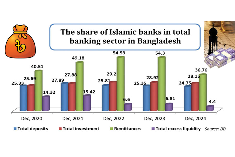 However, Islamic banking activities in the country passed another gloomy year in 2024, mainly due to poor governance and irregularities in some major banks. The decline in the market share of the Islamic banks to the total banking industry indicates the overall weakness of the sector. At the end of December 2024, the share of Islamic banks in the country's total banking industry was 24.75 per cent in deposits, which was 25.35 per cent at the end of December 2023. In terms of investment, which is loan and advance in conventional banking terms, the ratio stood at 28.15 per cent at the end of last year against 28.92 per cent at the end of 2023.