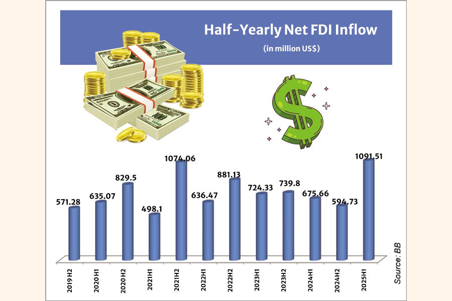 The jump in net FDI in the first half of the current year is a record in recent years, and the surge helped to post a 19 per cent rise in the inflow of net FDI in the last fiscal year (FY25), when net inflow of FDI stood at $1686.24 million against $1415.46 million in FY24.
