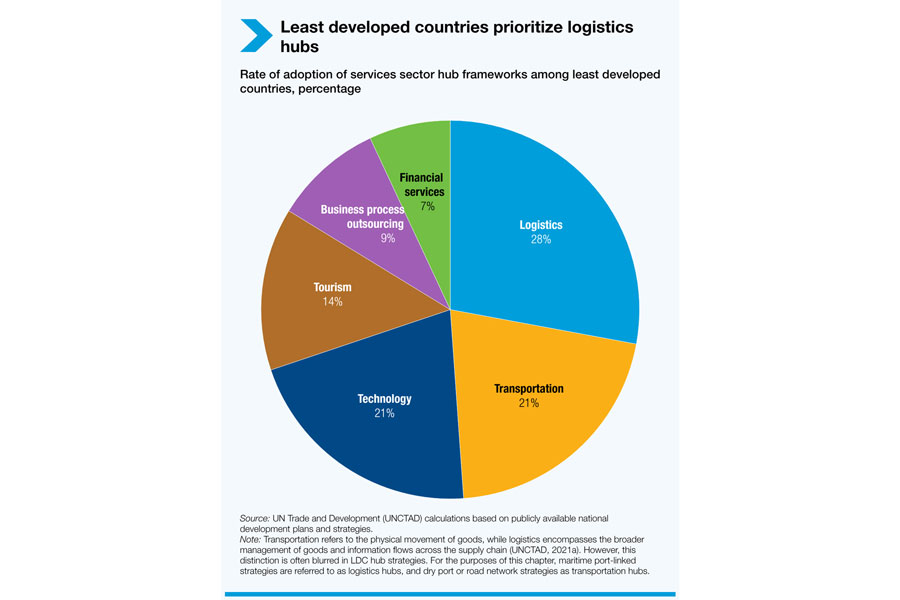 Overall, the UNCTAD publication outlined the challenges facing LDCs and provided policy guidelines to overcome them. For instance, it noted that LDCs are increasingly adopting hub strategies, meaning they are concentrating investment and policy support in specific services or locations. It found that LDC policymakers have prioritised logistics hubs, followed by transportation and technology hubs. Logistics covers the management of goods and information flows across the supply chain, while transportation refers to the physical movement of goods. The report confined maritime port-linked strategies to logistics hubs and dry port or road network strategies to transportation hubs. The UN agency also cautioned that hub strategies may be costly and deepen debt vulnerabilities. At present, around half of the LDCs are in debt distress.