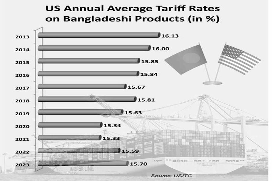 Last year, bilateral trade between the two countries stood at $10.53 billion with trade balance significantly titled towards Bangladesh as total exports to US stood at $8.28 billion. The average tariff on Bangladeshi imports was 15.70 per cent in 2023 when the US customs collected $1.02 billion in customs duties against import of Bangladeshi goods worth $8.28 billion, according to USITC data.