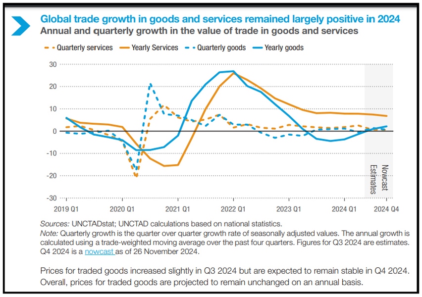 The World Trade Organization (WTO) statistics also supported the UNCTAD estimate. In the second week of this month, WTO released its latest data showing that world merchandise trade volume rose by 1.1 per cent quarter-on-quarter and 3.3 per cent year-on-year during the third quarter (July-September) of 2024. It also said that the growth marked the fourth consecutive quarter of moderate trade expansion.