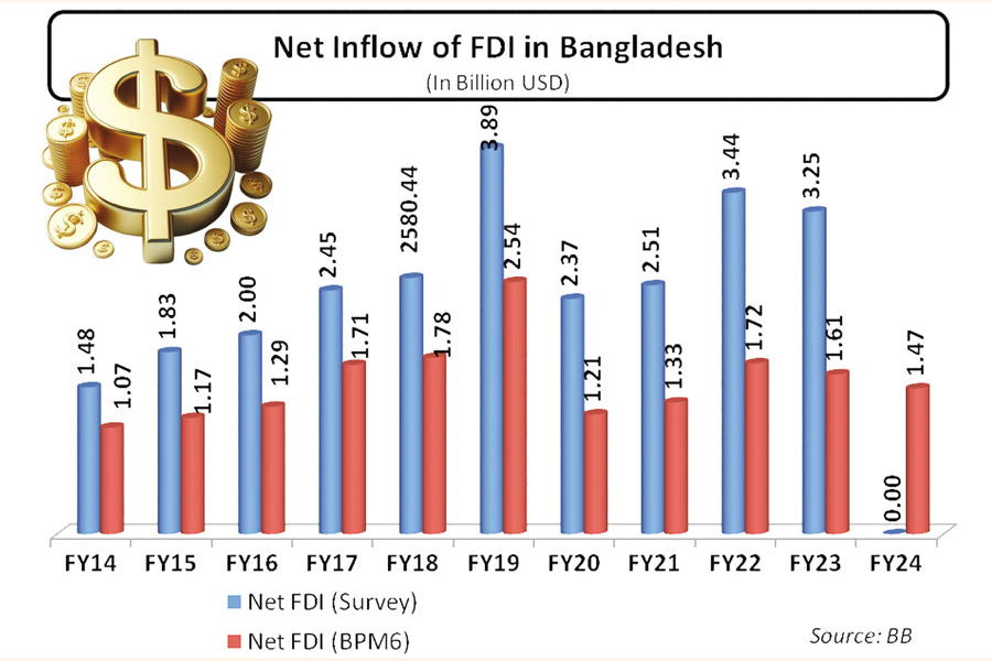 The latest statistics on FDI, released by Bangladesh Bank last week, also gave rise to a few queries about the overall FDI situation in the country. The most important question is whether the statistics provided by the central bank regarding FDI represent the actual scenario. The half-yearly report titled 'Foreign Direct Investment and External Debt January-June, 2024', prepared and published by the statistics department of Bangladesh Bank, showed that the country received US$1.47 billion as net FDI in FY24 which was $1.61 billion in FY23. A year back, the January-June 2023 version of the report, however, showed that the net inflow of FDI in FY23 stood at $3.25 billion.