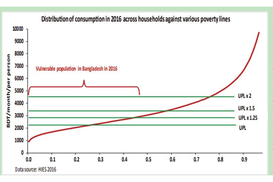 The robust economic growth of 6.0 per cent to 7.0 per cent during the last decade helped Bangladesh to win its fight against poverty - mainly through employment generation channel. Jobless rate is likely to surge leading to a sharp rise in poverty. According to current projections (before Covid-19), poverty rate still is 20.0 per cent implying that almost 32 million people are poor. Poverty measurement uses a poverty line threshold to identify poor persons. If per capita income is lower than the poverty line even by Taka 1.0, he or she is considered poor. Like many other countries, Bangladesh adopts a low poverty line for poverty measurement - suggesting large numbers of the population, who are vulnerable, are not counted as poor.