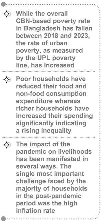 This study provides evidence on poverty and inequality dynamics during the pandemic and the post-pandemic inflationary period, on the livelihoods of different types of household in Bangladesh, and on their coping mechanisms. The study identifies several key findings related to poverty rates, household spending, multidimensional poverty, social safety net distribution, and the pandemic’s effects on other socioeconomic dimensions such as education, and healthcare. The key findings are discussed above.