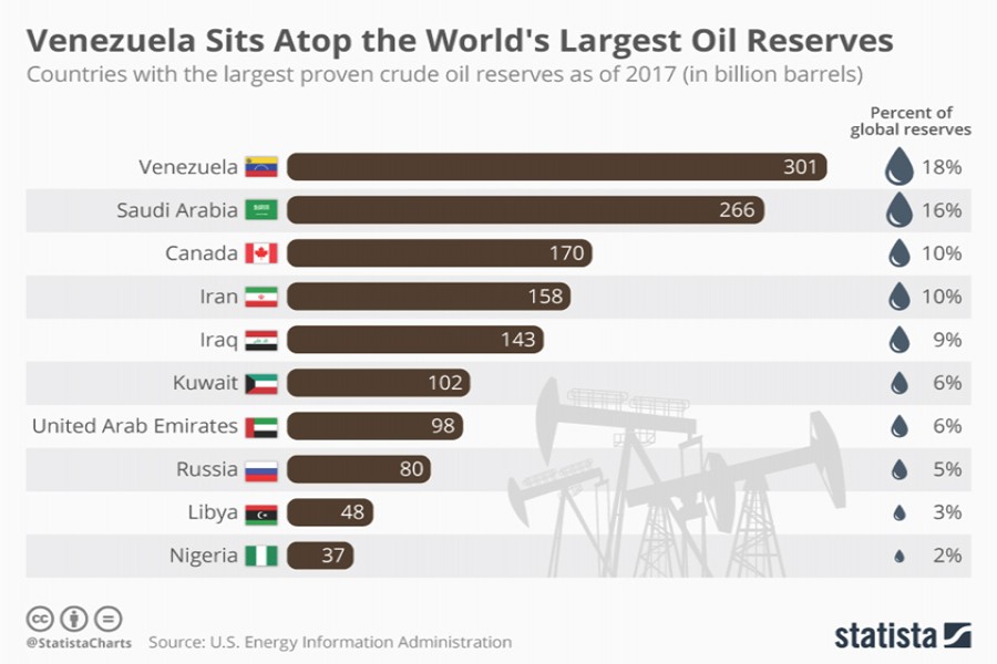 OIL CURSE! Venezuela has the world's largest oil reserves, with an estimated reserve of 301 billion barrels as of 2017, accounting for 18 per cent of the total proven global reserves. The United States has long been the biggest market for Venezuelan crude oil - close to 35 per cent of total export went to the US in 2017.