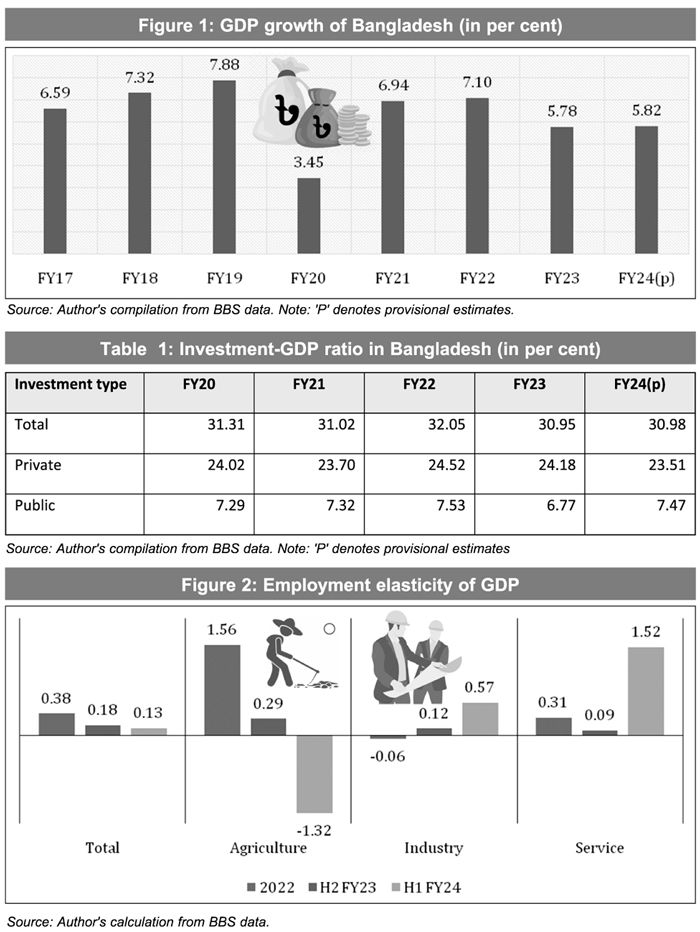 In Bangladesh, it is a matter of regret that it has become customary to set targets concerning the macroeconomic framework that are not consistent with ongoing realities. For FY2024, the government initially targeted a gross domestic product (GDP) growth of 7.50 per cent despite existing distresses in the macroeconomic scenario. As per the Monetary Policy Statement (MPS) of the Bangladesh Bank, released in January 2024, this target was revised down to 6.50 per cent. Several multilateral agencies were less optimistic regarding Bangladesh’s GDP growth prospects. For instance, the Asian Development Bank (ADB) projected Bangladesh’s GDP growth in FY2024 to be 6.1 per cent. Similarly, the IMF and World Bank projected the corresponding figure to be 5.7 per cent and 5.6 per cent, respectively.