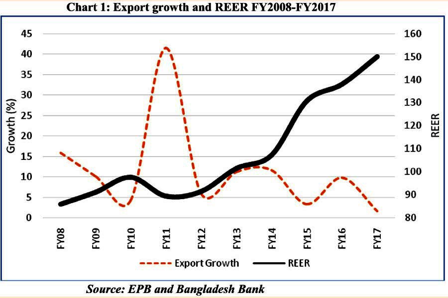 Starting with the intensive phase of trade liberalisation in early 1990s, Bangladesh experienced double digit export growth for nearly 20 years. During this entire period, though not overly proactive, exchange rate management was prudent with the real exchange rate hovering around a relatively narrow band with the help of mini devaluations until the Taka was floated in 2003. The real effective exchange rate (REER which is the nominal exchange rate adjusted for inflation differences between Bangladesh and its major trading partners) remained fairly stable and moderately depreciated to keep exports competitive. Trade economists consider the REER to be the more relevant indicator as it reflects overall exchange rate competitiveness by taking into account the movements in the nominal exchange rates and inflation in relation to the country's major trading partners. Trade economists have been strong in their advice that countries should avoid overvaluation of their REER as it has deleterious effects on exports. In the past few years, the Bangladesh real exchange rate has taken a turn for the worse, thus hurting exports. Between FY2012 and FY2017, the REER appreciated by nearly 45 per cent serving as a significant damper on exports (Chart1). As expected, exports remained sluggish throughout this period. In FY2018, the situation improved somewhat not so much due to the modest nominal depreciation of the Taka but rather for the appreciation of the US dollar and other external developments.