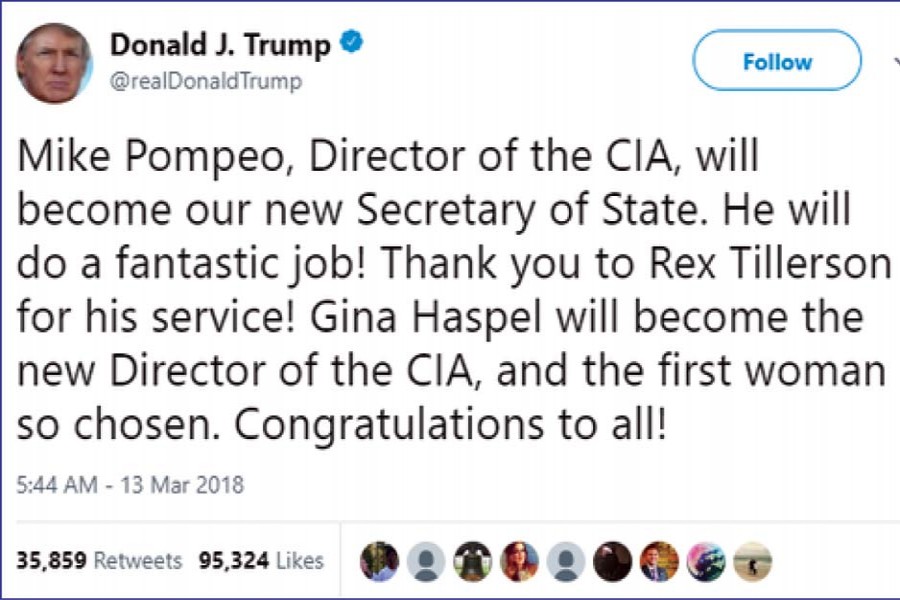 President Trump had been threatening to sack Rex Tillerson since he found out soon after appointing the former EXXON-Mobil chief as the Secretary of State that he had a personality and was not adept at sycophancy. The news of the sacking came via one of the US president's famous tweets - perhaps better to call these infamous now - in which he not just conveyed his decision to sack Tillerson but also to appoint the CIA boss Mike Pompeo as the new Secretary of State. And in that tweet, he also appointed Gina Haspel as the CIA boss and predicted that the new Secretary of State would do a "fantastic job" and congratulated himself for appointing Gina Haspel to become the first woman chief of the CIA!