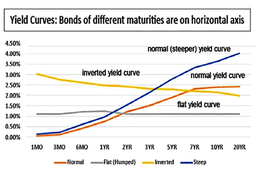 It is incongruous to think as though all interest rates behave in the same way. In practice, the behaviour of interest rates on various bonds depend on their maturity. That is what the yield curve is about -- a chart depicting the interest rate paid on bonds of different maturity dates but with equal risk exposure (credit quality). The curve reflects the short, intermediate, and long-term rates of Treasury Bonds (in short Treasuries). In the U.S. the yield curve is often referred to as a proxy for investor sentiment on the direction of the economy. They are commonly found in three shapes: upward sloping, flat (or humped), and inverted (or downward sloping) -- each reflecting useful information about future interest rate changes and economic activity.