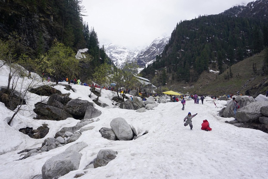 We woke up early in the next morning and witnessed a magnificent view from the hotel balcony. The snow laden silver peaks of the mountains were calling us. We were just awe-struck for moments. We had our breakfast and got ready quickly for our first-ever expedition in the land of snow. Sathpal took us to a local tour operator from whom we purchased a package of Rs.8000.00 for a voyage towards Hampta Pass. After crossing 32 turn-offs on the breathtakingly steep roads in 2 hours, we reached the sea of snow at the altitude of 14000 feet. A couple of deodar trees were standing there in a meditative mood. The boys didn't take time to play with snow. Also there was rain all on a sudden. The cold drops were trying to get the warmth of our body through the snow jacket and trousers. Nevertheless, we continued our skiing, sliding etc. When we returned to the car of Sathpal, it was already 4 pm. We had our delayed but delicious lunch at "Taste of India", a restaurant with exceptional interior. Our next destination was Vashisht Temple. The Hindu mythology tells that the temple was built by Rishi Vashisht, one of the seven sages and also an instructor of Rama and Lakshman, somewhat 4000 years ago. The temple houses the famous hot water spring which is widely believed to cure skin and other diseases if someone takes bath there. The village of Vashisht always remains vibrant with the tourists and the Hindu pilgrims. After the temple visit, we returned to Hotel in the evening amidst drizzling.
