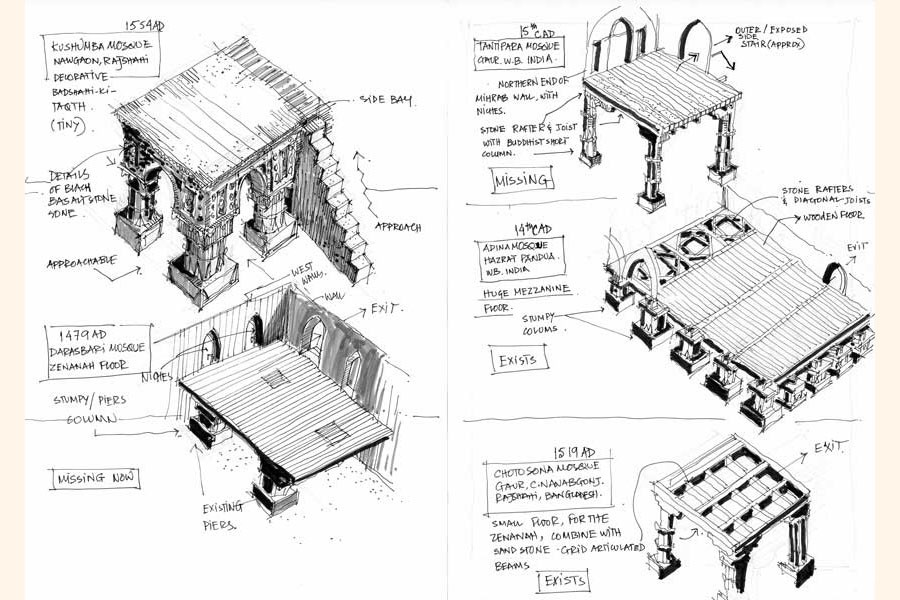 Conceptually contained with rural influence of Bengal in a mosque is a brilliant interpretation to justify the interest properly. Most of the medieval mosques are elaborated with local motives and cultural ethos. Traditional curved cornice, turrets (four stumpy verticals on four corners) terracotta bricks, composite terracotta, chouchala vault etc. are the inherent ingredients of the medieval mosques.