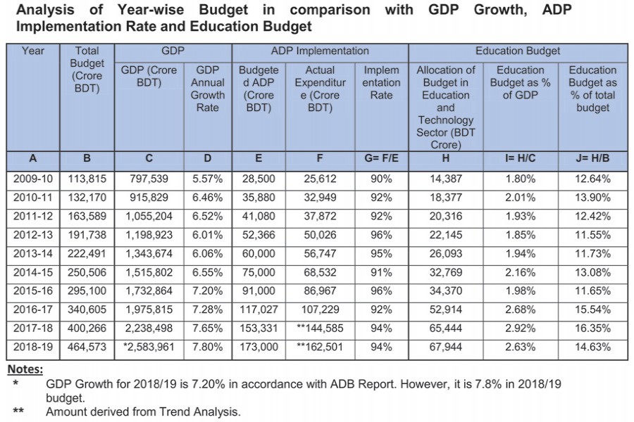 We can have a better investment figure in development by incorporating allocation in education sector as investment in ADP. If we look into total budget outlay, we can see that it was Tk 1,138 billion (Tk 1,13,815 crore) in FY 2009/10 and rose to Tk 4,645 billion (Tk 4,64,573 crore) in FY 2018/19. It shows a four-time rise. As we recap the GDP, it was Tk 7,975 billion (Tk 7,97,539 crore) in FY 2009/10 and expectedly jumped to Tk 25,839 billion or Tk 25,83,961 crore (estimated) in FY 2018/19. The GDP growth rate as are seen has been sustainable at 7.20 per cent to 7.8 per cent (estimated) between FY 2015/16 to FY 2018/19. The investment in the economy also rose in a dynamic manner. In FY 2009/10, education plus ADP was Tk 429 billion (Tk 42,887 crore) that has reached Tk 2,409 billion (Tk 2,40,944 crore) in the upcoming FY 2018/19.