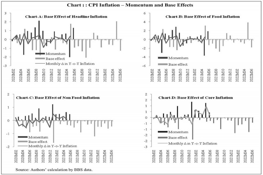 Inflation measurement has two key dimensions which include economic and statistical factors. Economic factors arising from price movement of different commodities of CPI basket can be ascribed as momentum. On the other hand, the statistical factors are stemmed from the price swing twelve-months earlier which can be attributed as base effect. The base effect in inflation can be positive or negative with different magnitudes. If the change between the price indices of the two consecutive months of the base period is negative, then current inflation will suppress, offsetting the price momentum. The opposite will happen when the price change is positive, uplifting the present measured inflation. Therefore, it is very important to measure the momentum and base effect of inflation which would help forecast robust inflation, providing guidance for price stability.