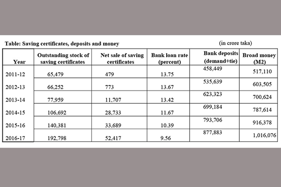 The savings certificates scheme has also been alleged to be responsible for the recent crunch on bank liquidity. This allegation is a bad example of identifying correlation with causation. The net sale of savings certificate instruments massively accelerated since 2012-13 (see Table). Within four years the net sale jumped from a mere 7.73 billion (773 crore) to 524.17 billion (52,417 crore) taka. During the same four-year period the money supply increased by 4,125.71 billion (412,571 crore) taka, a very robust 68 per cent increase. Total bank deposits also increased by 64 per cent during the same time. That the monetary growth was more than adequate is reflected in the nominal interest rate coming down from a high 13.67 per cent to 9.56 per cent. The real interest rate also came down from 5.74 to 4.12 per cent. How were these possible if the massive expansion of the savings certificates had caused an equivalent reduction in monetary (deposit) growth? What does the recent announcement of an increase in the advance-deposit ratio indicate about the assessment of the monetary condition by Bangladesh Bank?