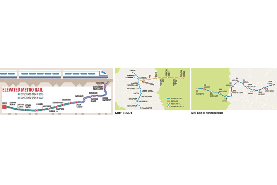 MASS RAPID TRANSIT LINE 5 (MRT-5): The 41km metro line-5 comprises of two routes. The northern one is expected to be completed by 2027 and the southern by 2030. The 20-km northern route is proposed to stretch from Hemayetpur of Savar to Bhatara through Baliarpur, Amin Bazar, Gabtoli, Dar-Us-Salam, Mirpur, Kachukhet, Banani, Gulshan and Natun Bazar with a total of 14 stations, of which nine will be underground and the rest elevated. Preparation of a draft project document for the northern route is underway. Meanwhile, a loan agreement for engineering assistance was signed in June 2018. The metro rail authorities have given a proposal for hiring engineering service consultants to carry out feasibility studies. On the other hand, a pre-feasibility study on the 21km southern route began in May 2018 with loans from a development partner. The southern route stretching from Gabtoli to Bhulta is set to be completed by 2030. The route alignment, number of stations, location of depot, and underground and elevated sections of this route will be determined through the pre-feasibility study. The possible stretch of the route will go through Technical intersection, Kalyanpur, Shyamoli, Asad Gate, Russel Square, Panthapath, Sonargaon, Hatirjheel, Rampura, Aftab Nagar, Dasher Kandi, Baralu Bazar and Ganga Nagar, before terminating in Bhulta.
