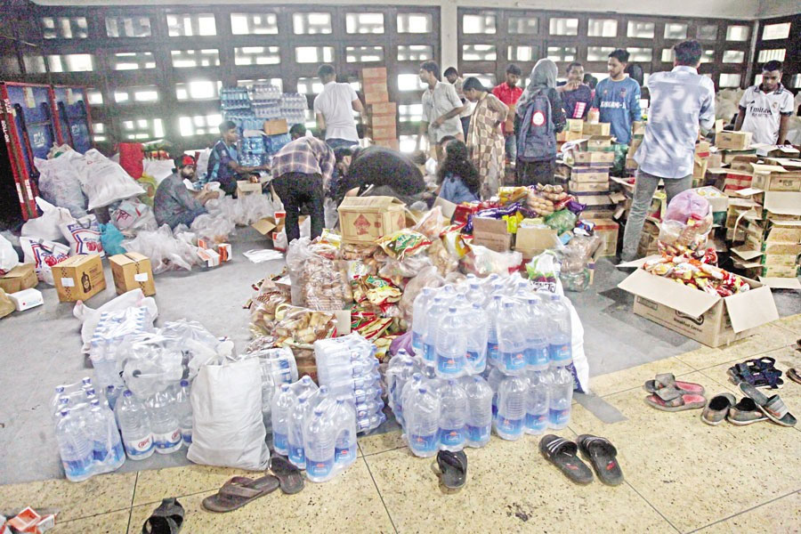 It is heartening to find that hundreds and thousands of people, especially younger ones, have joined their hands to mobilise relief materials for the flood-affected people in the country's south-eastern part. People enthusiastically donate money, clothes, dry foods, bottled water, water purification tablets and other drugs, candles and lighters, and other necessary materials. Students of schools, colleges, and universities collect money and materials from different households. They also work days and nights to pack the materials for distribution. Various voluntary organisations are rushing relief materials to the affected areas. Religious institutions also lend their hands.