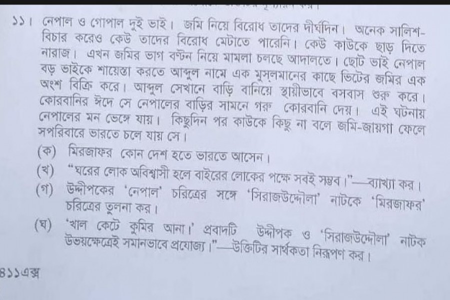 In the Dhaka board's first paper Bangla, not only have the guidelines set by the authorities been violated but an inappropriate and highly sensitive issue with the potential of damaging communal harmony and triggering inter-communal hatred has also been imported. Imagine the repercussion it is supposed to cause in impressionable minds! It is sure to challenge examinees to imagine the situation involving the two Hindu brothers who cannot see eye to eye and the Muslim man who sacrificed a cow on the land he purchased from one brother but in front of the house of another brother.