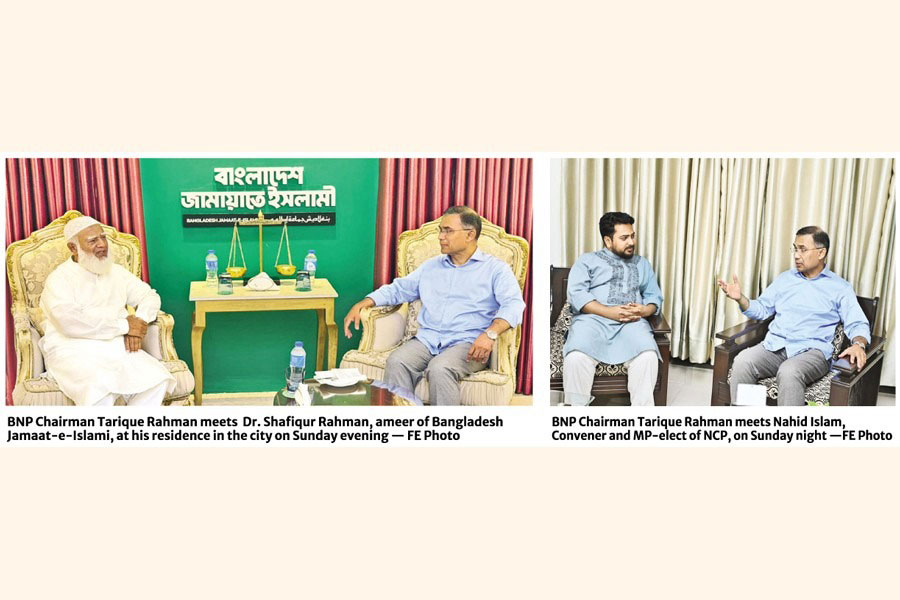 BNP chairman, Tarique Rahman paid a visit to Jamaat-e-Islami Ameer Shafiqur Rahman at the latter's Bashundhara residence last Sunday (February 15) evening. Terming it 'a historic moment in national politics', the Jamaat leader, Shafiqur Rahman, reaffirmed his party's commitment, along with the 11-party alliance, to build a prosperous nation based on democratic principles. Later, the BNP chief also visited Nahid Islam, Convener of the National Citizen Party (NCP), at the latter's residence at Bailey Road in the city. This marks a clear departure from the prevailing culture of animosity and hatred towards one's political opponents, which is a legacy of the past era.