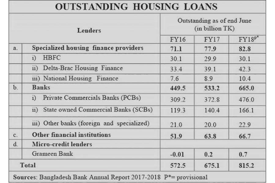 HOUSING LOAN PORTFOLIOS: Meanwhile, significant changes in total housing loan portfolios have also helped the real estate sector. Total outstanding housing loans from banks and financial institutions as of June 2018 amounted to TK 815.2 billion, which was 9.6 per cent of total credit to the private sector. Over the past few years, private banks with ample deposit resources have been expanding their housing loan portfolios. These banks had the dominant market position with the largest amount of TK 476.0 billion in outstanding housing loans as of June 2018.