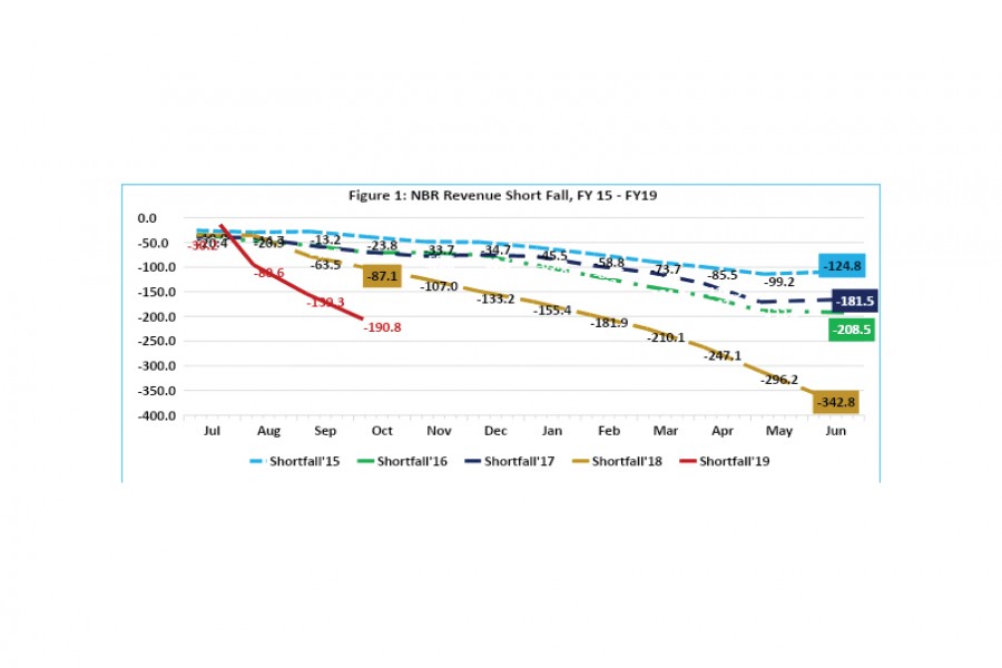 But the unfortunate development is that Bangladesh has not been able to realise the revenue targets (which are on the lower side) set out in the last five budgets. Figure 1 captures the cumulative revenue shortfalls in the last five budgets (i.e. from FY 15 to first six months of FY 19). Cumulative revenue shortfalls have been widening in each of the last five budgets. In FY 15, cumulative revenue shortfall was BDT 124.8 billion. In FY 18, the cumulative revenue shortfall increased by almost three times to BDT 342.8 billion. Cumulative revenue shortfall in the first four months of FY 19 has been estimated at BDT 190.8 billion - more than double of the amount reported for FY 18 - BDT 87 billion.