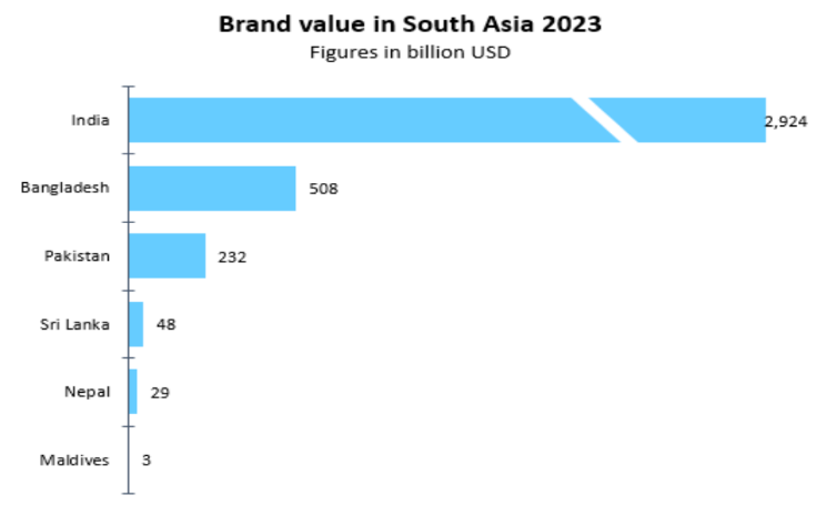 While Pakistan, Sri Lanka, and Nepal each have brand values of USD 232 billion, USD 48 billion, and USD 29 billion, correspondingly, Bangladesh is second to India in terms of brand value among the South Asian nations.