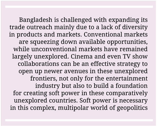 Bangladesh is challenged with expanding its trade outreach mainly due to a lack of diversity in products and markets. Conventional markets are squeezing down available opportunities, while unconventional markets have remained largely unexplored. Cinema and even TV show collaborations can be an effective strategy to open up newer avenues in these unexplored frontiers, not only for the entertainment industry but also to build a foundation for creating soft power in these comparatively unexplored countries. Soft power is necessary in this complex, multipolar world of geopolitics.