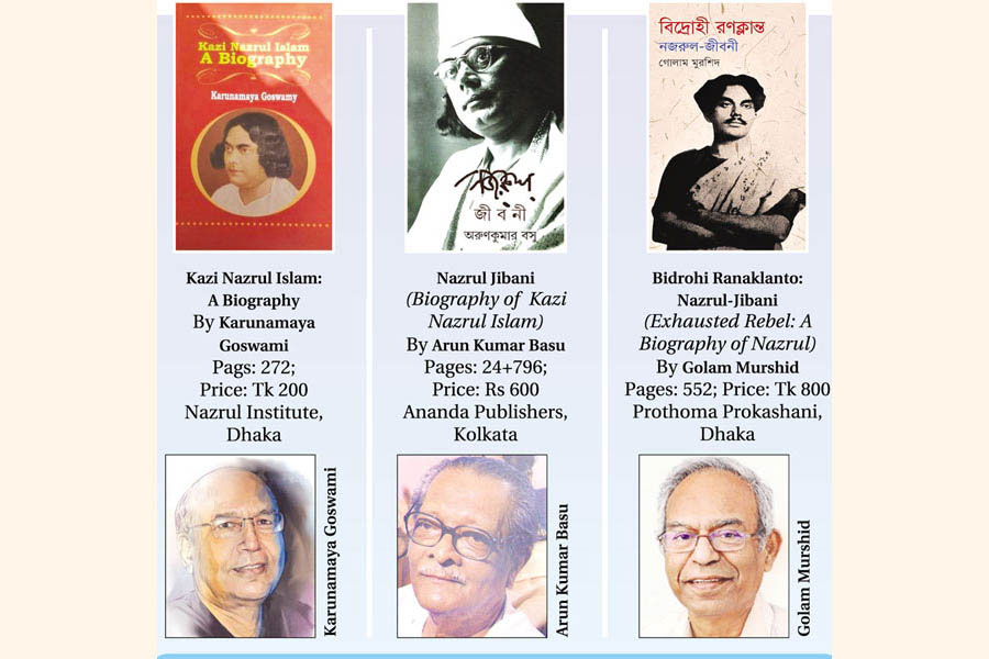 Since then, Nazrul had been enthralling the people of Bengal and remained indispensable for them. His literary works are versatile and his life is more than amazing. How a poor boy, through an extreme and passionate struggle, turned a towering figure of Bangla literature is the query that continues to drive people over a century. A life that endured through the versatility of soldier, journalist, musician, poet, politician, singer, composure, yogi and sufi is unparallel in the contemporary world. That’s why many Nazrul exponents and researchers have devoted their efforts to unearthing the versatile life and works of the rebel poet decade after decade and produced a few hundred biographies, if not a thousand. Not all are full-length and adequately researched, and some are full of errors, omissions and emotions. Again, some books focus on a particular side or aspect of the prodigious Nazrul. The exercise goes on till today and will continue in future. As the nation observed the 48th death anniversary of the rebel poet on Tuesday (August 27), and the year also marked the 125th birth anniversary (May 24) of him, the national poet of Bangladesh, this article has tried to review three comprehensive biographies of Nazrul in brief. Two of these are in Bangla and the third one is in English.