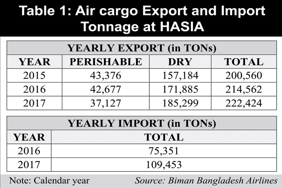 OUTGOING AIR CARGO: At present the situation is messy. All outgoing cargo (containers and pallets) are stuffed inside the airport, where facilities are very crowded. This results in delays, shipment errors and pilferage. The growth of air cargo exports is rapid as can be seen in Table 1. The rate of growth of dry tonnage is 8.5 per cent per annum: Perishable cargo stagnated due to inability to export directly to UK ethnic market, but that should change now. Outgoing air cargo related to manufacturing includes RMG and footwear samples, products of the pharma industry, fresh fruits and vegetable, and RMG products that need rapid shipmentwhen too late for ocean transport. Table 1 reports the recent growth of export air cargo. As industrial development continues air cargo will be essential for shipping high value industrial export products. The present situation is unacceptable for a modern manufacturing economy.