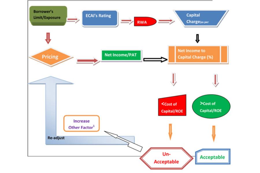 User of the model has to decide ROE/Cost of Capital first. To assess your borrower through the model, you have to consider the borrower's ECAI's rating, Customer's Limit/Exposure, proposed pricing/margin, Cash Collateral, Cost of Deposit, Overhead Cost, Provision and Fees & Other Income (if any). The following flowchart describes a detailed picture of the model: