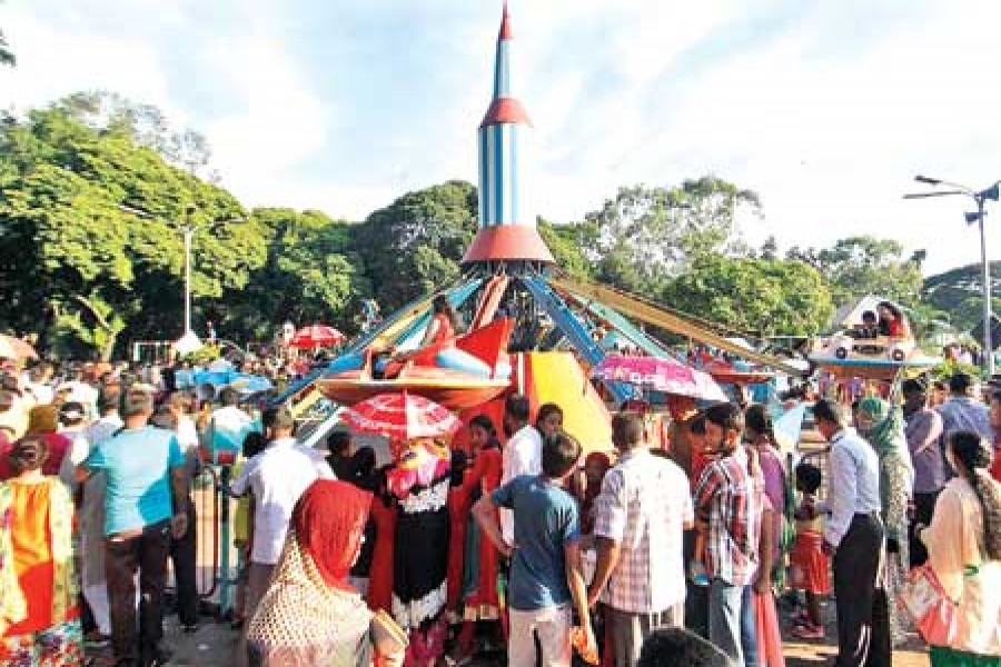 The amusement spot draws thousands of people of all ages every day. The rush is increasing. Nearly four decades ago when the park opened, the area used to become deserted after dusk. The roads would witness a handful of transports then. All this has changed radically. It cannot be reversed. Many people suggest expansion of the park to the south which might help stop spilling over of the crowds onto the footpaths and roads. Vast swathes of the park bordering the Suhrawardy Udyan appear to remain unused.
