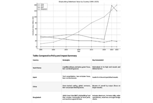 Conclusion: The post-crisis resurgence of Korea, Japan, and China demonstrates how state intervention, modernisation, and strategic alignment with global market trends can transform a vulnerable industry into a national asset. Bangladesh, with its abundant labour pool and high optimised and favourable geography, holds untapped potential in shipbuilding. A coordinated, policy-driven approach—centred around financial incentives, capacity building, and export-oriented industrialisation—can lay the foundation for a competitive and resilient domestic shipbuilding sector.