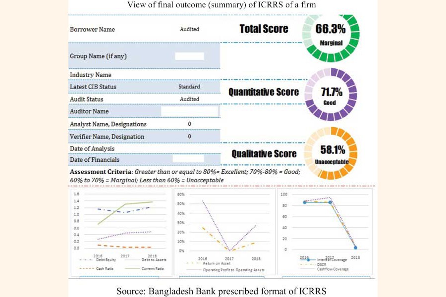 These features have made ICRRS a comprehensive tool of credit risk management in Bangladesh. Another good thing is ICRRS' flexibility. If a company scores poor, still it can get loan, if the concerned borrower's bank can properly justify the lending. In case of score 80 and above it will be marked 'Excellent', for 70 to 79, it will be 'Good', for 60 to 69, it will be 'Marginal' and for below 60, 'Unacceptable'. If a company scores 'Unacceptable' in ICRRS, borrower bank still can renew their credit facilities for 2 (two) more times. So a firm has still chance to improve in its financial and other parameters and can utilise existing credit lines till that time.