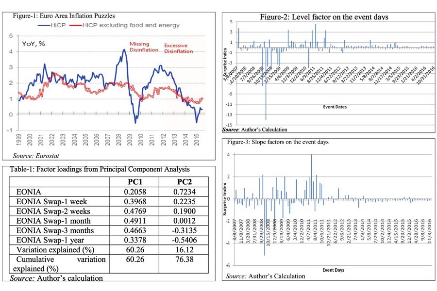 METHODOLOGY: Monetary policy decision comprises of two components: one is the decision itself and another is follow up communication clarifying the decision. It is the unanticipated component of monetary policy known as surprise factor that potentially captures the effect of monetary policy on asset prices. Although there is a wide pool of ECB's interest rate to choose from, this article uses EONIA, EONIA Swap rate of different maturities notably 1 week, 2 week, 1 month, 3 month and 1 year to measure surprise factors. It is reckoned that unexpected component of monetary policy decision drives the very short term rates (EONIA in euro zone) on the meeting day while EONIA swap rates for different maturities reflect the market expectation of ECB's key interest rate path over a longer horizon. The array of six series supposedly provides the pure monetary policy surprise. The daily changes of all interest rate series on the days when ECB announced its key UMP decisions are calculated collecting data from Bloomberg.