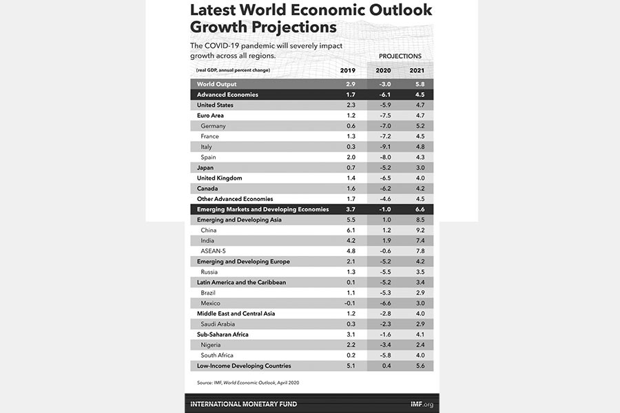 The IMF further predicted the contraction of growth by 6.1 per cent in advanced economies with the US economy contracting by 5.9 per cent, Japan 5.2 per cent and Germany 7.0 per cent. Developing economies, except China, are expected to experience negative growth rates between 1.0 and 2.0 per cent. Income per capita will fall in more than 170 countries.