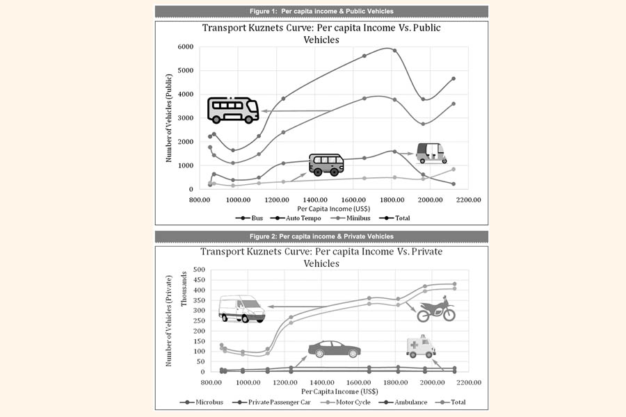 In Figure 1, public transport formed a rough Kuznets curve along the per capita income until 2018. Still, the number increased slightly in 2019, emphasising government investment in the sector. However, in Figure 2, there is a different scenario. Private vehicles failed to establish a Kuznets curve along the per capita income. Over the years, the number of private vehicles tended to rise as the per capita income rose in the country and eventually plateaued in 2018 and 2019. So, even though public vehicles and per capita income form a Kuznets curve, it’s not the case for private vehicles.