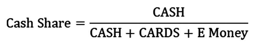 Where CASH denotes the total value of ATM cash withdrawals, and CARDS represents debit and credit card payments. E-money is defined as a stored-value arrangement in which funds are stored on a card or mobile phone (akin to an electronic wallet). This ratio indicates the extent to which cash remains a primary payment instrument in an economy.