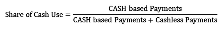 Measuring Cash Use in Bangladesh. To estimate the extent of cash reliance in Bangladesh’s retail payment system, we use an equation conceptually similar to that proposed by Khiaonarong and Humphrey (2022), but adapted to reflect Bangladesh’s financial market structure and data availability. The indicator for the Share of Cash Use in Retail Payments is defined as follows: