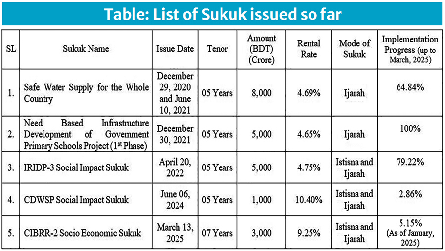 End note: Sukuk play a pivotal role in driving socio-economic development and enhancing the stability of the Islamic financial sector in Bangladesh. By funding key infrastructure projects such as roads, schools, bridges, and water systems, Sukuk contribute to employment generation, to increase productivity, and broader economic growth. These instruments also support poverty alleviation and empowerment of rural people by improving connectivity and public welfare in underdeveloped regions. Moreover, Sukuk promote financial inclusion by offering Sharia-compliant investment opportunities to individuals and institutions that are hesitant to invest in interest bearing instruments due to religious restrictions.