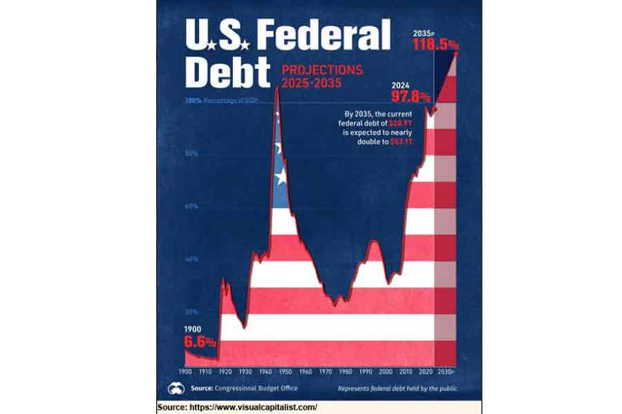 Federal or sovereign debt is the total amount of money the US government owes to lenders both at home and abroad. That debt now amounts to US$36.2 trillion representing 122.6 per cent of the country's GDP relative to 34.5 per cent in 1980 and is continuing to grow. That is about US$106,000 for every citizen of the country. The annualised cost of servicing this debt was US$726 billion in July 2023, which accounted for 14 per cent of the total federal spending in that year. The share of federal debt held by foreigners has declined in recent years. In December 2024, foreigners held 30 per cent of the publicly held debt compared to 50 per cent in 2014. Interest on the debt paid to foreigners in 2024 was $230.6 billion. The interest payment bill is now emerging as the single largest item in the UD federal budget amounting close to $1 trillion.