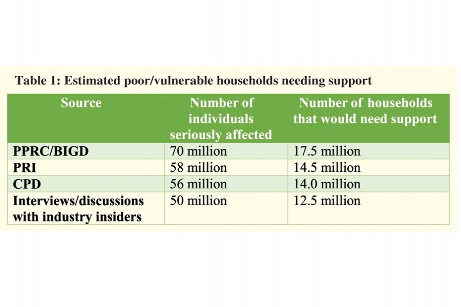 Despite varying estimates, it is quite clear that the number of households who would need assistance is within an acceptable range. A simple average of the four estimates (Table-1) would result in 14.60 million households. The government has already announced a specific wage support programme for the RMG workers. If the factory owners are interested to take advantage of the package and strive for paying their employees, which they claim of a size of 4.0 million, these workers' households might not require any further direct cash assistance. There is currently no information on the number of unique households comprising garment workers. However, under plausible assumptions, consideration of unique garment workers' households, could lead to a need for assistance for a lower number of 10.0 million to 12.0 million households. However, it is worth pointing out that the recent crisis has revealed that wage digitisation covers only around 12.0 per cent of garment workers and it is not clear if factory owners, even with the assistance of wage support package, will pay for their all workers when they are away from work.