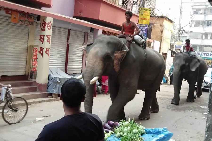 Put to many such uses, they are not corrupted, though. But the scene can be completely different when their presence is announced on the capital's streets. When a lone elephant ambles on Dhaka streets among an array of vehicles, it is a sight indeed! There is likely to be a gathering of enthusiasts. But here is an elephant that has not come to entertain people with its playful antics. The man riding on its back has a particular purpose behind bringing the huge animal on the road.