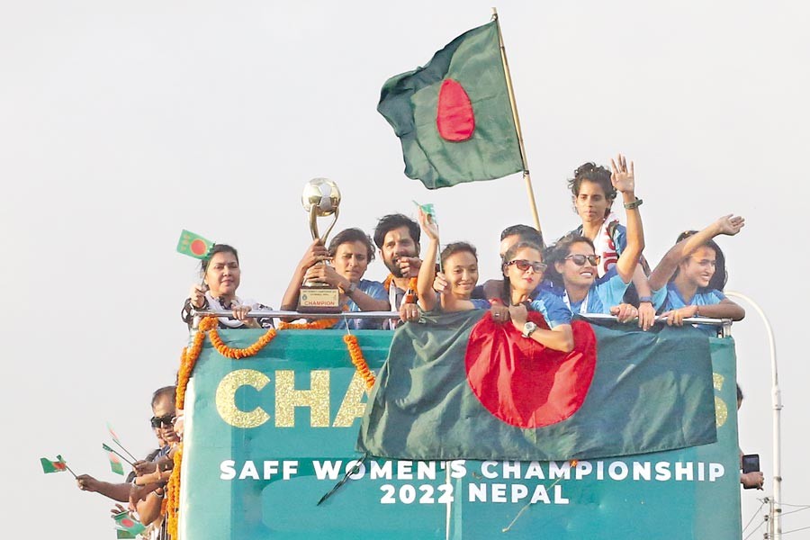 If overcoming the social outlook was a major achievement on the part of the women footballers, the discrimination they still face in terms of facilities for training, arrangement of league or other tournaments and remuneration is abysmal. Most of the girls hail from poor and marginal families. And lo! when the members of the champion team are awash with goodwill and accolades, there were two pieces of news concerning the eviction attempt of families of two of the players from the land they were allocated for their earlier success. A few of the players have for their shelters nothing but dilapidated shanties. There is also a downside to the euphoria that swept the team on their return from Kathmandu with the trophy. Money and valuables from two of the players' luggage went missing. What a shame! Who the villains are to rob these girls of their hard-earned money? Let the culprits be identified for awarding them the punishment they deserve.
