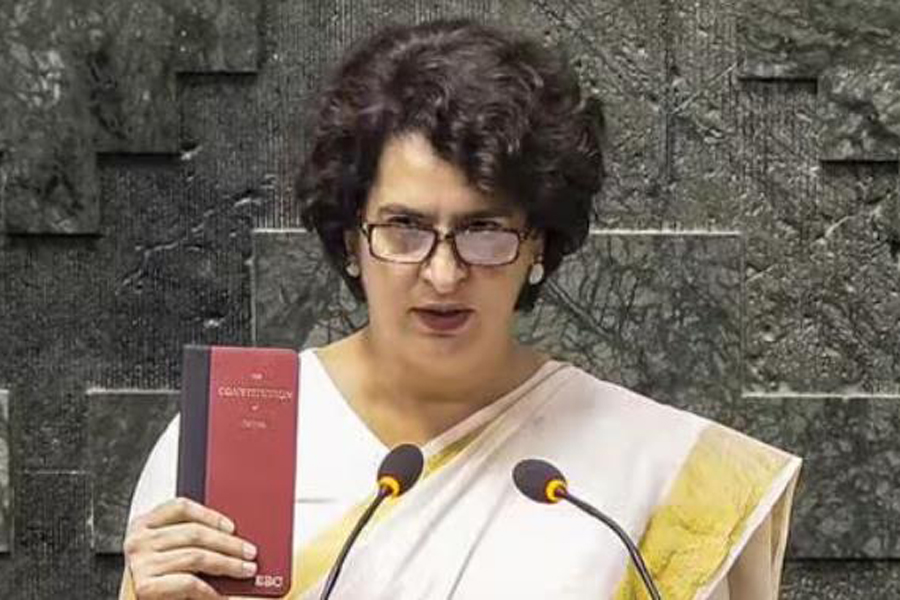 Priyanka Gandhi took affirmation in Hindi while holding a copy of the Constitution soon after the House met.
